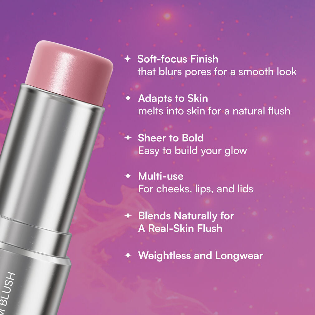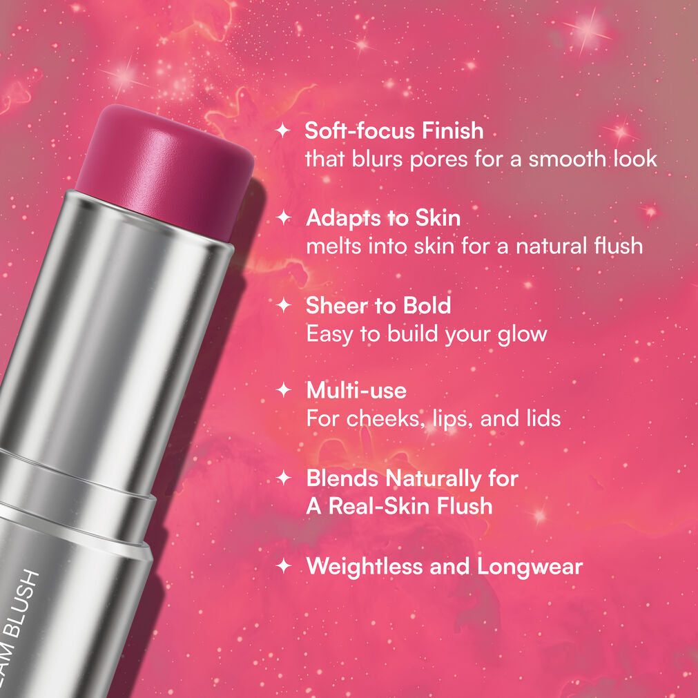 Inspired by the shifting hues of distant nebulae, it delivers a soft, cosmic flush that feels like it was always yours—natural, seamless, and unmistakably you. With every swipe, it adds a healthy, vibrant glow that brightens your face and lifts your mood, making you look just a little more alive, even on your most minimal days.